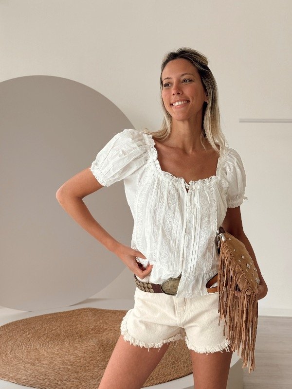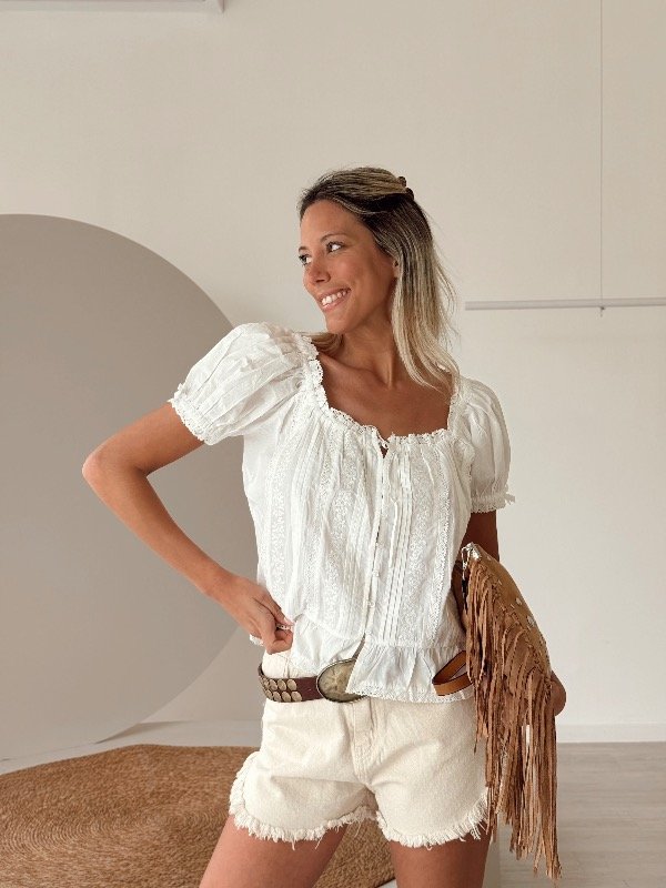 Blusa de algodón bordado con puntilla frunce en manga corta y moños