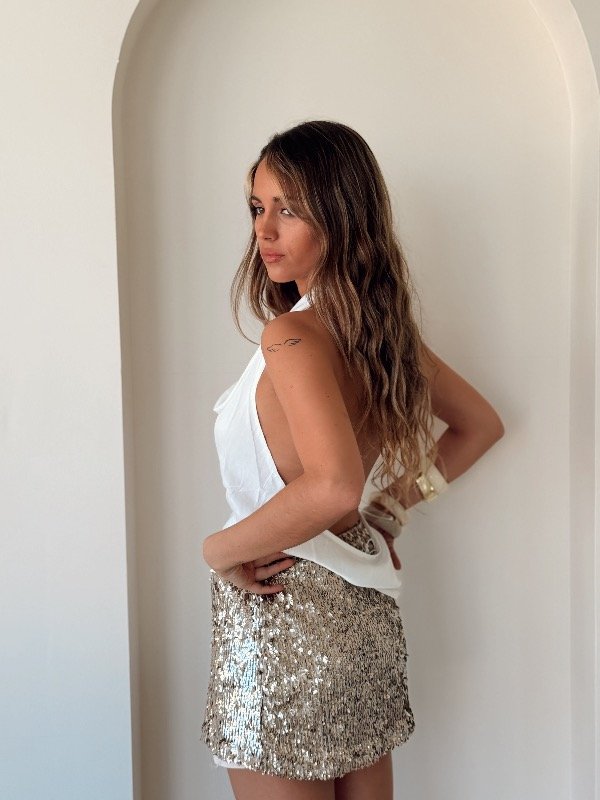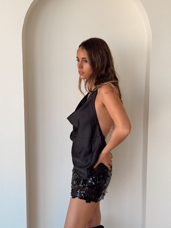 Top escote halter con botones internos en escote espalda. Confeccionado en tela Satén