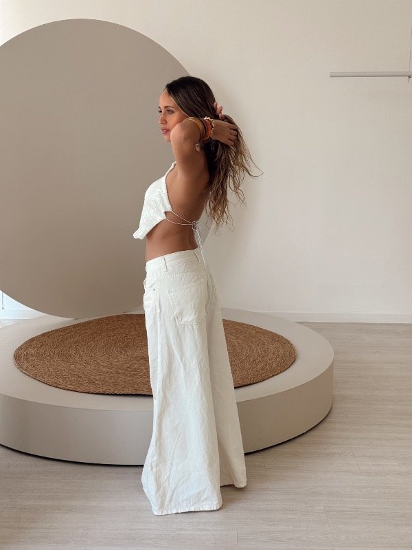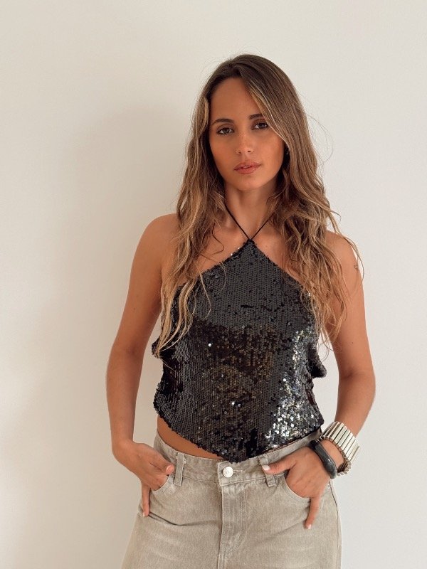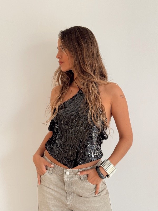 Top corte asimétrico de lentejuelas con forreria interna lazos para atar en cuello y espalda