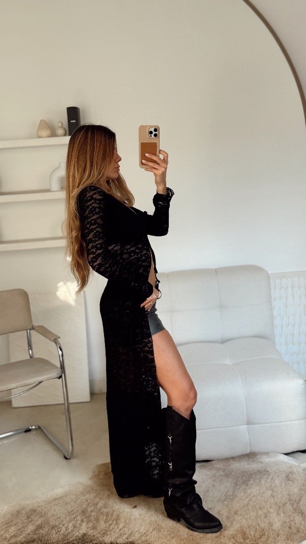 Kimono de encaje manga larga, con forro en el pecho y lazo para atar. Talle único